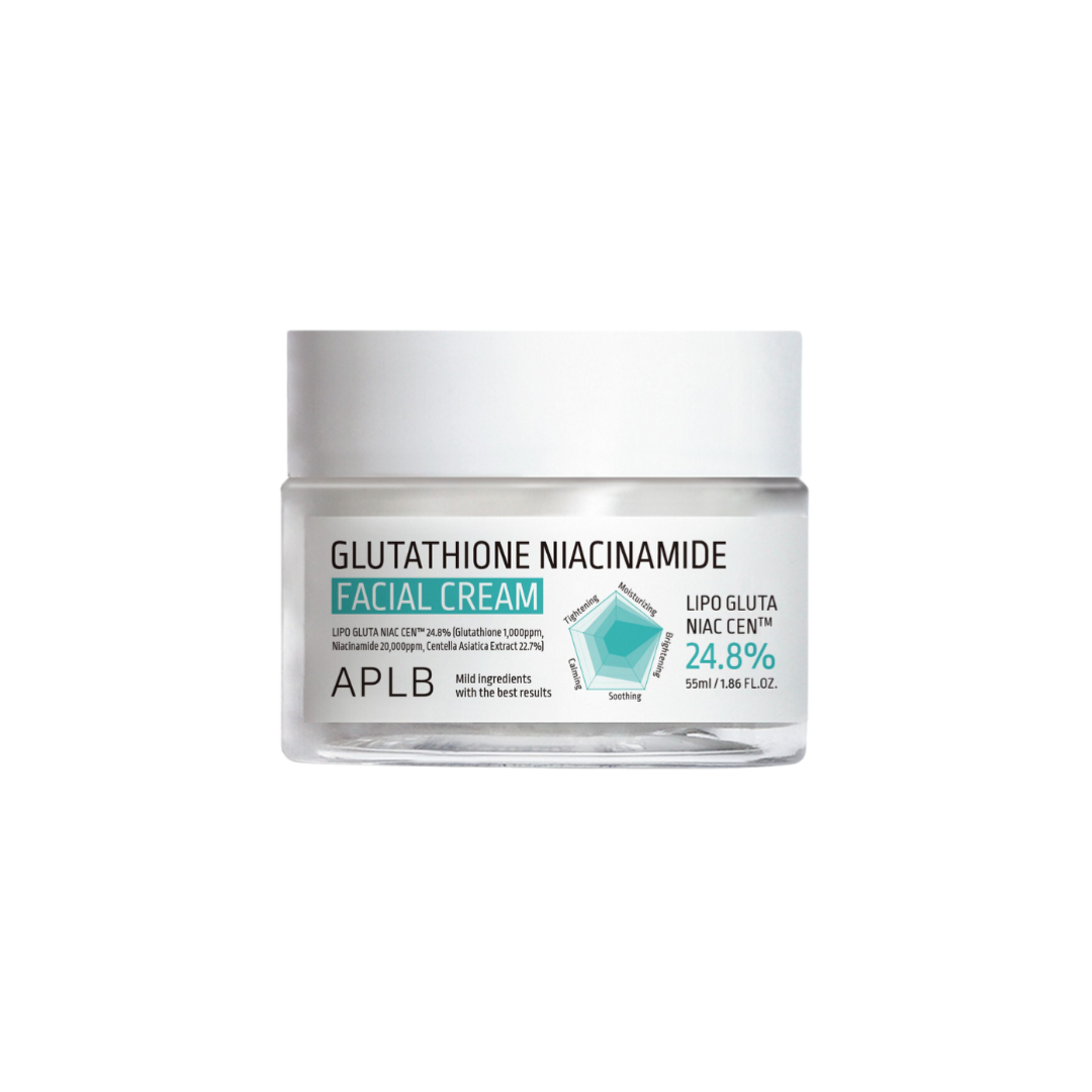 APLB Glutathione Niacinamide Facial Cream is a brightening moisturizer that combines 2% Niacinamide and 1,000 ppm of Glutathione to enhance skin tone and diminish dark spots. With 22.7% Centella Asiatica Extract, it calms irritation and moisturizes deeply using Shea Butter, Macadamia Seed Oil, and Squalane. Hydrolyzed Collagen and Cholesterol boost elasticity and strengthen the skin barrier. Suitable for all skin types, this cream leaves skin smooth, firm, and glowing.