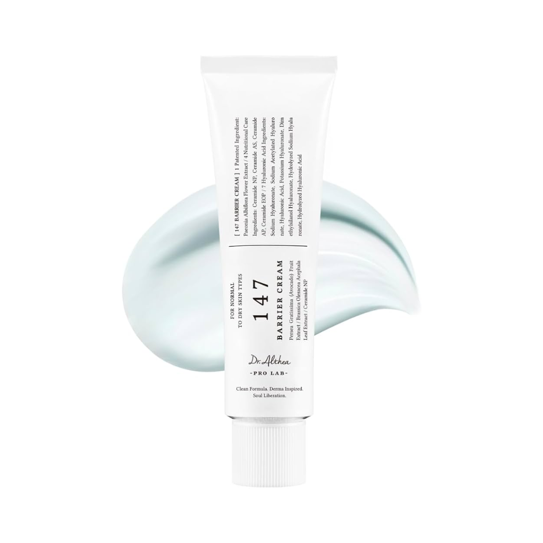 DR. ALTHEA 147 Barrier Cream is a rich, restorative moisturizer formulated to reinforce the skinโs natural protective barrier. Enriched with a powerful blend of Ceramides and eight types of Hyaluronic Acid, this cream delivers deep, long-lasting hydration to dry and sensitive skin. Botanical extracts like Coptis Japonica Root, Avocado Fruit, and Artemisia Leaf help soothe irritation and promote a calm, balanced complexion. With a smooth, non-greasy finish, it locks in moisture and supports healthy skin function, making it ideal for those experiencing dehydration, sensitivity, or barrier damage.