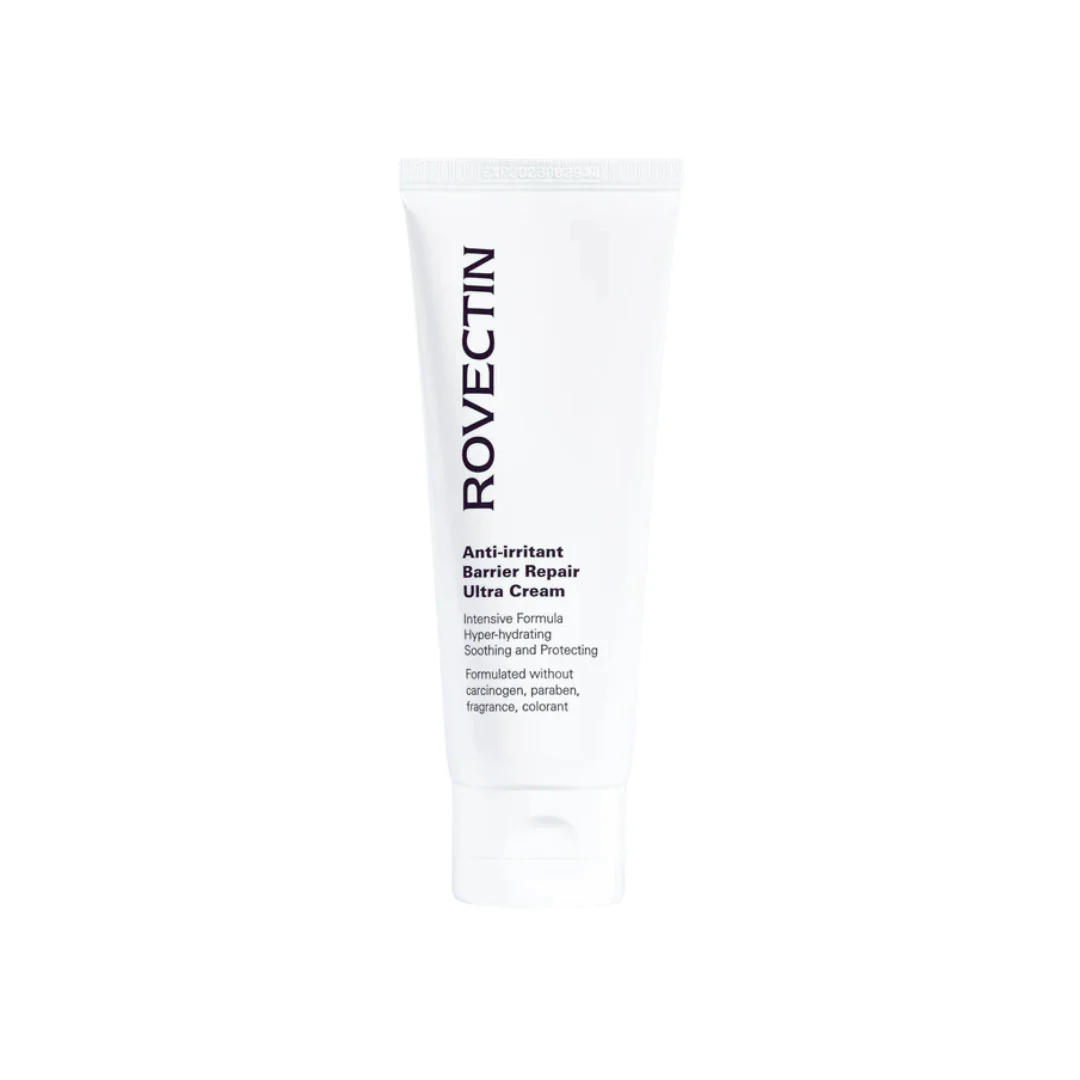 ROVECTIN Anti-Irritant Barrier Repair Ultra Cream is a nourishing moisturizer designed to strengthen the skin's barrier and reduce irritation. It combines Sunflower Seed Oil, Niacinamide, and Ceramides to moisturize and repair, while natural extracts like Turmeric and Moringa Oil soothe and protect the skin. Ideal for sensitive or dry skin, this cream helps to restore a healthy, hydrated complexion.